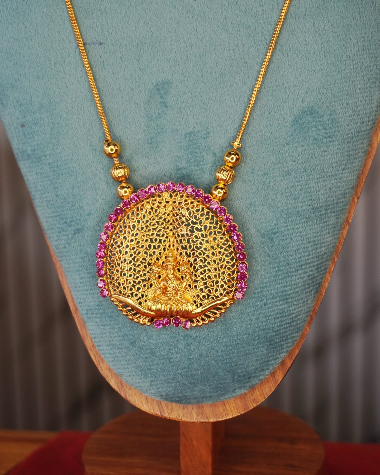 Add a touch of divine elegance to your jewellery collection with this exquisitely crafted Temple Design Haram. Featuring a beautifully detailed central pendant inspired by traditional South Indian artistry, this piece showcases intricate carvings highlighted with vibrant pink stones that enhance its regal charm.