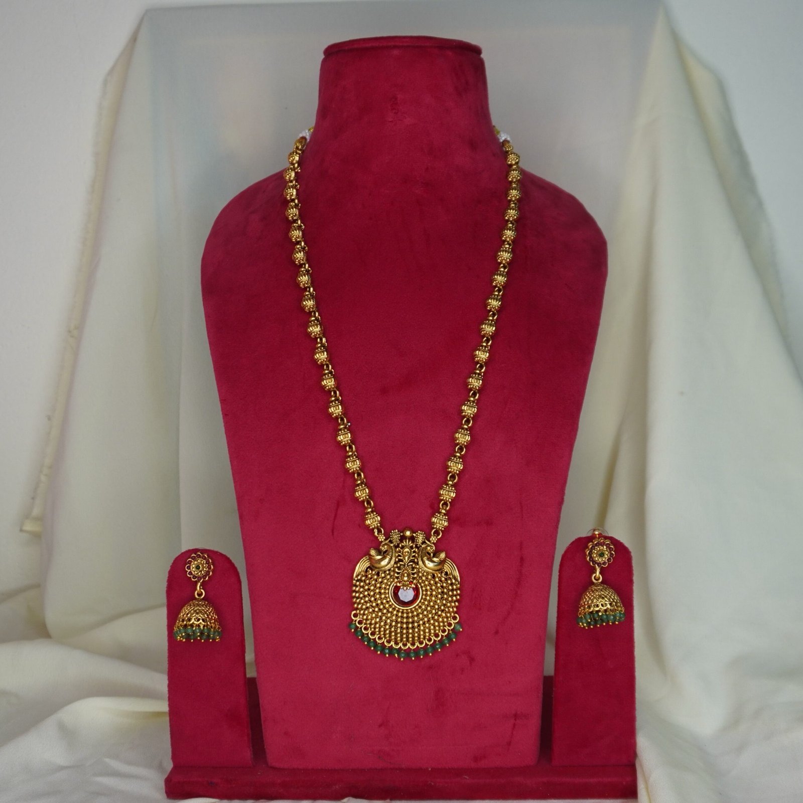 - Design: Traditional gold-plated set with red & green Kemp stones.
