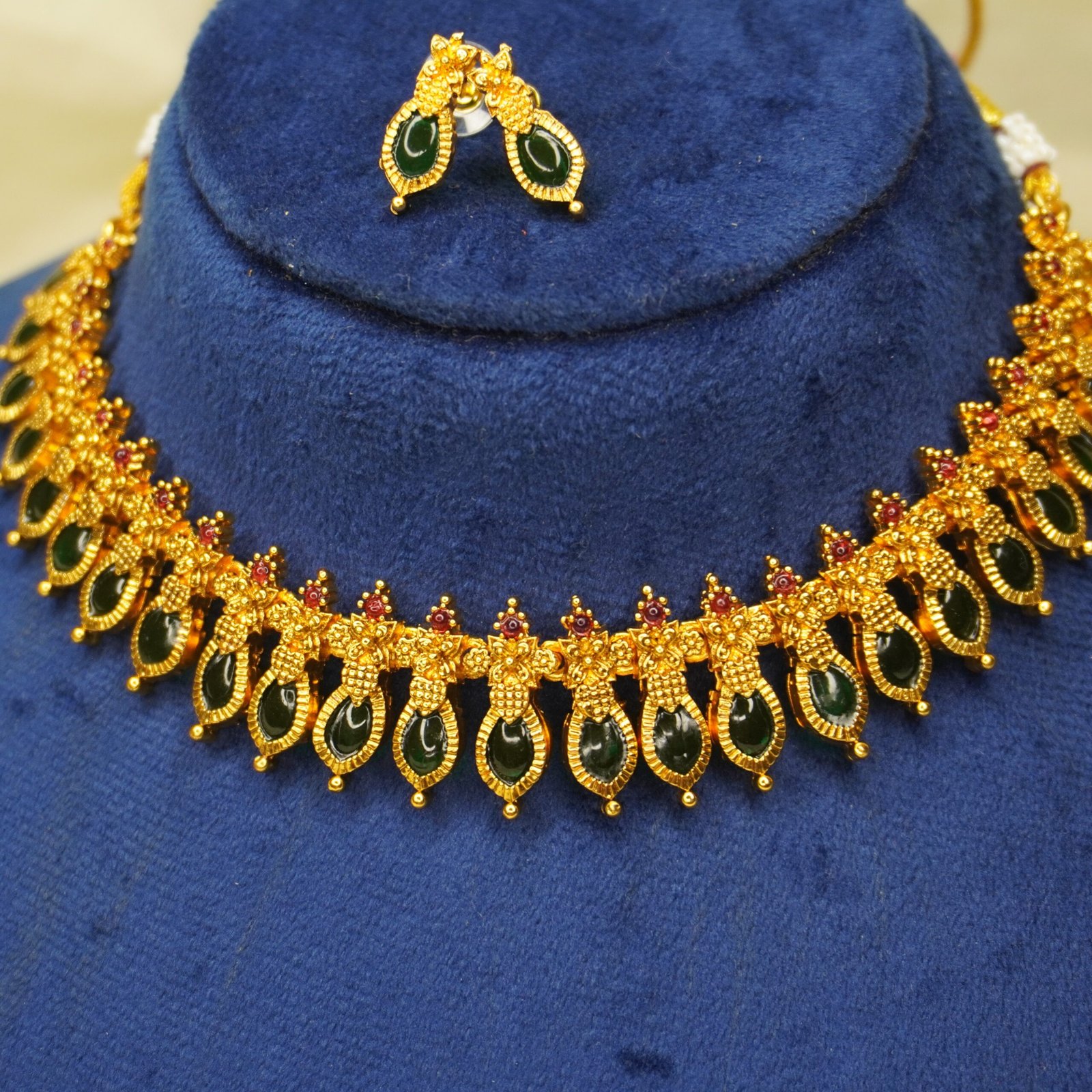 - Traditional Kemp stone necklace set with matching jhumka earrings