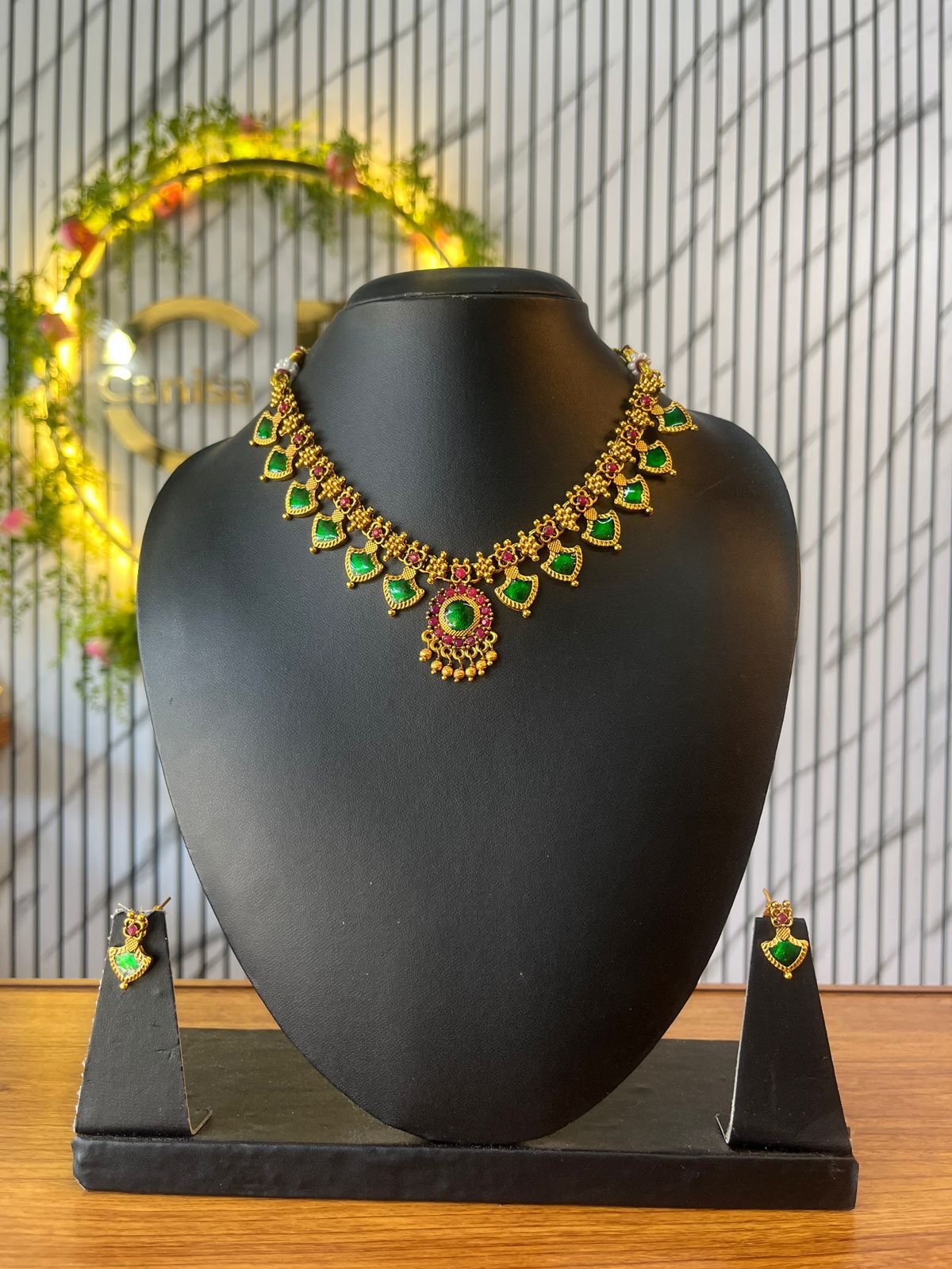 Add a touch of heritage to your ensemble with this exquisite Antique Necklace Set, crafted in a traditional design and finished in antique gold. The necklace features an elegant arrangement of red and green stones, evoking classic South Indian temple jewelry styles. Paired with matching earrings, this set strikes a perfect balance between simplicity and sophistication. Ideal for weddings, festivals, or cultural events, it complements both sarees and ethnic wear beautifully.