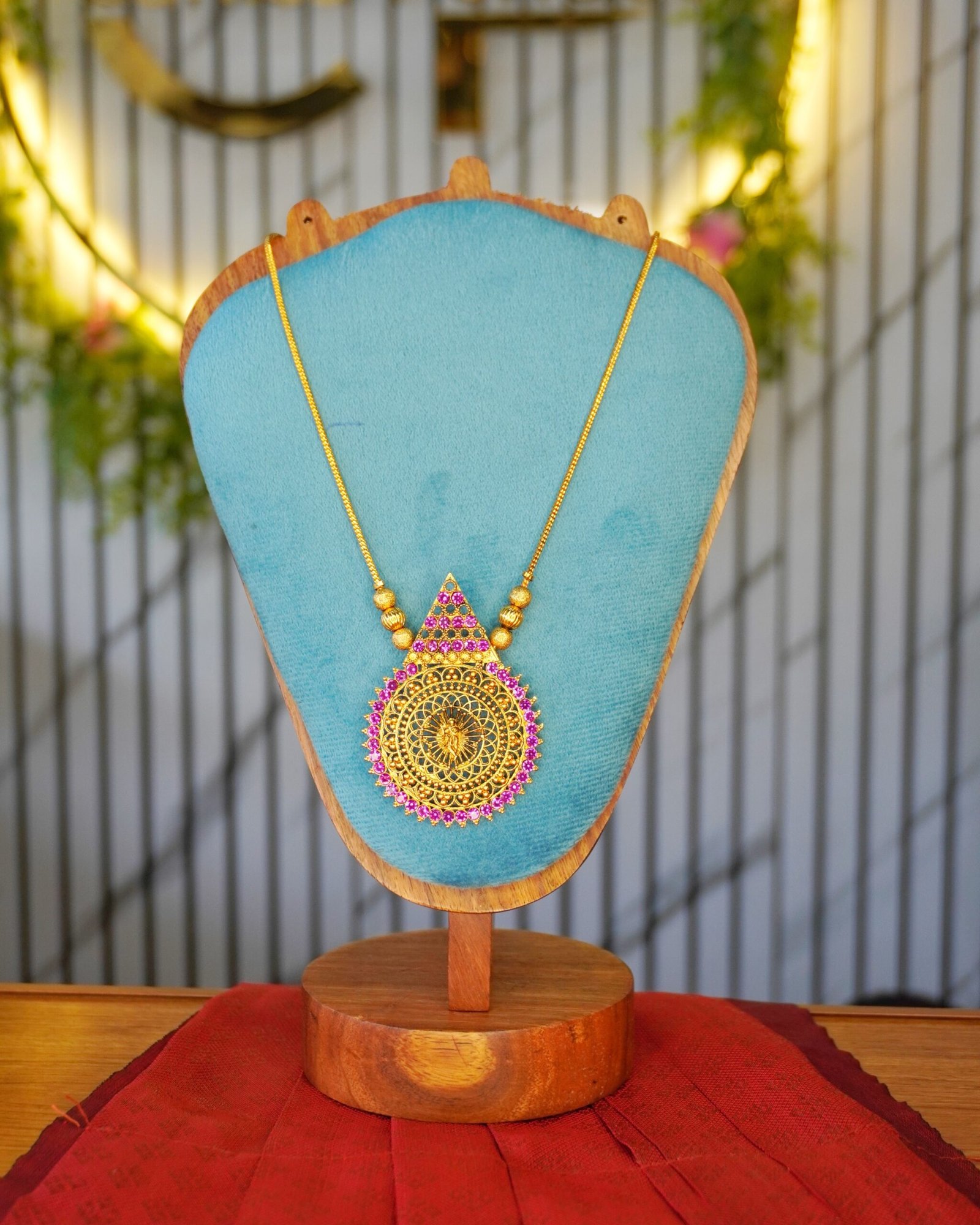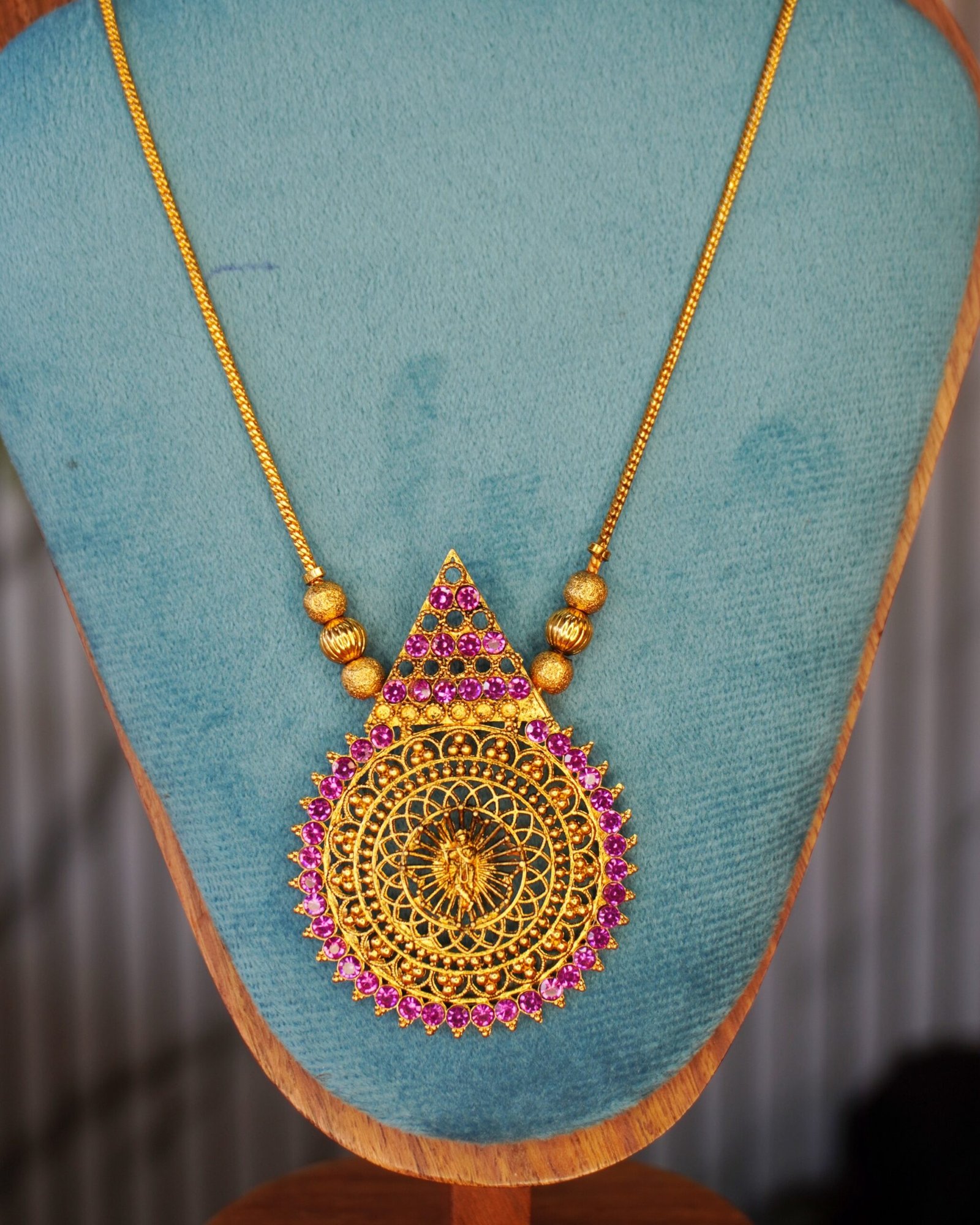 Add timeless elegance to your jewellery collection with this exquisite traditional haram. Designed with a beautifully crafted antique gold-plated mandala pendant, this piece features intricate filigree work highlighted with vibrant pink stones for a royal finish.