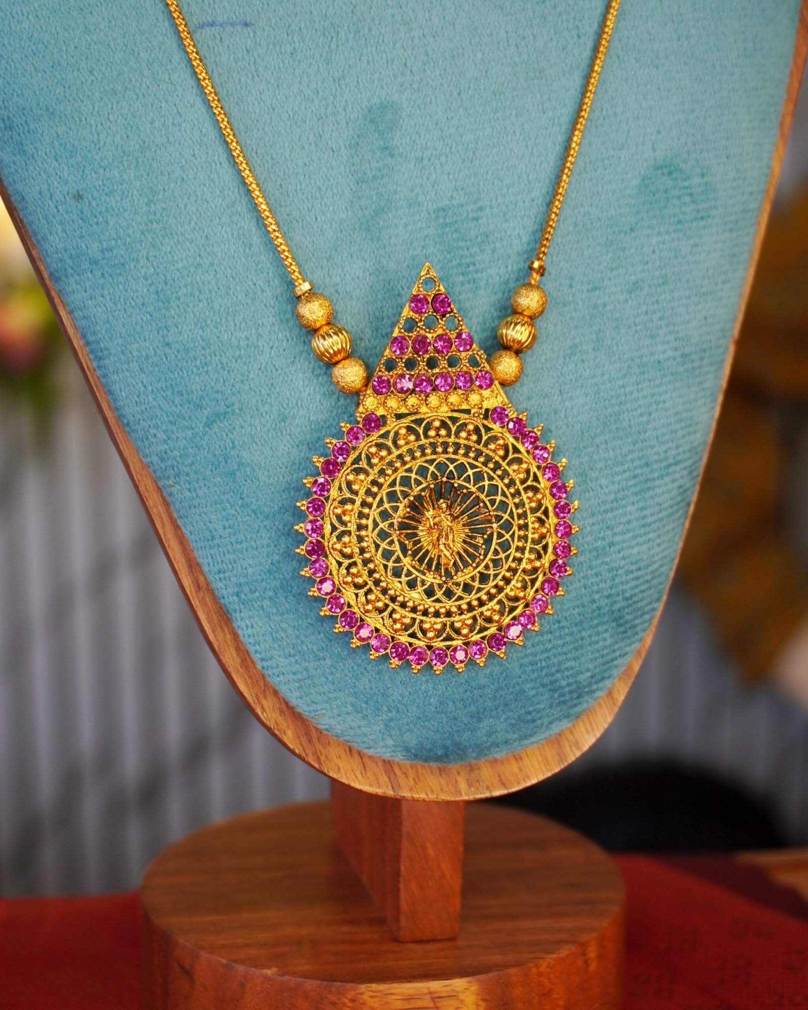 The long chain design is adorned with golden beads, giving it a classic South Indian look perfect for weddings, festive occasions, temple wear, and grand celebrations. Its lightweight feel and premium craftsmanship make it a comfortable yet eye-catching statement piece.