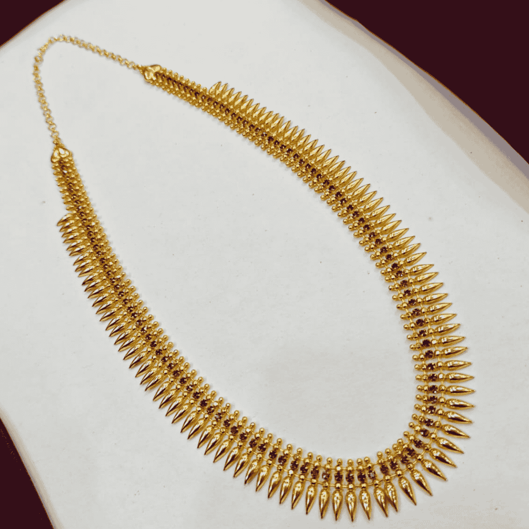 This striking gold-tone necklace features a dual-layered design, adorned with finely crafted spike-shaped motifs that add a unique and edgy charm to its traditional base. The intricate alignment of golden beads between the spikes enhances its dimensional appeal, giving the piece a rich and ornate finish. Perfect for those who appreciate bold yet refined jewelry, this necklace pairs beautifully with traditional sarees, temple jewelry sets, and festive ensembles. Despite its dramatic look, it remains comfortable for long wear, making it a versatile addition to any ethnic jewelry collection.